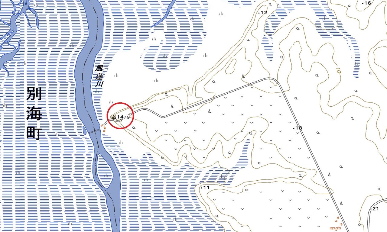 三角マークの三角点、標高14.9表記の地点