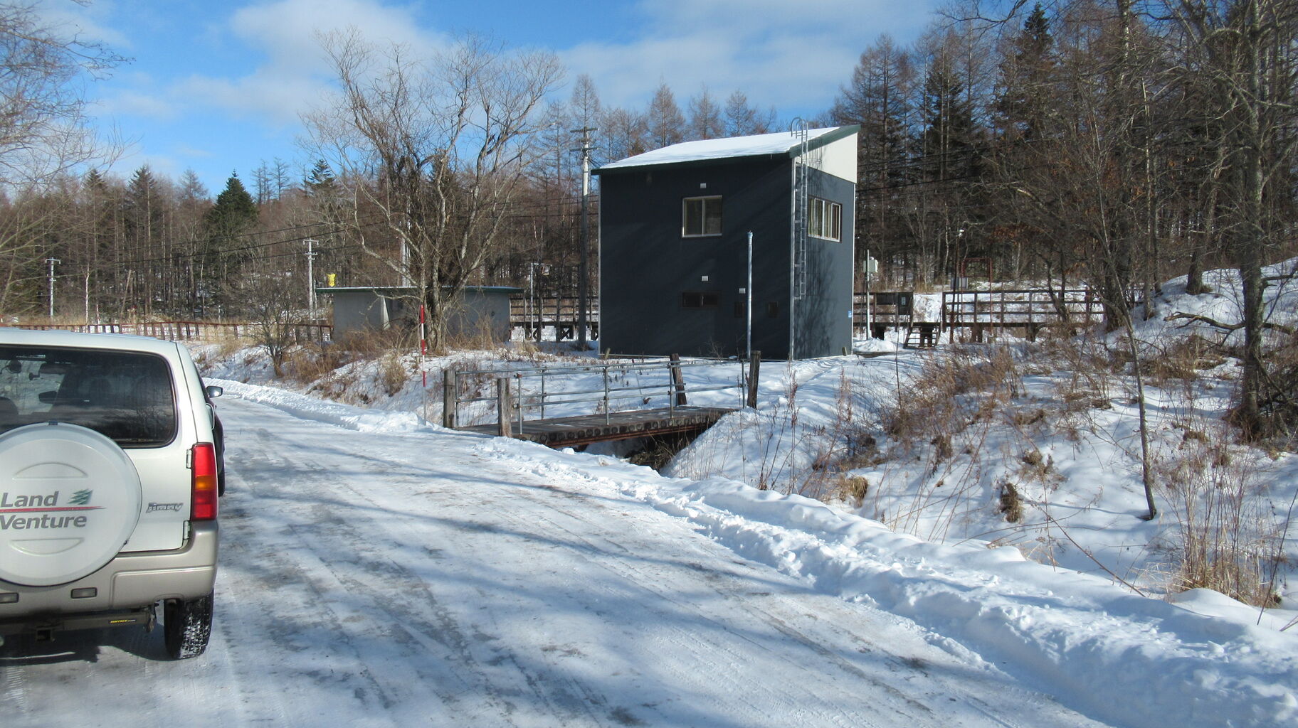 跨線橋からもう少し町道を進むと右側に砂利道の入り口があります。
