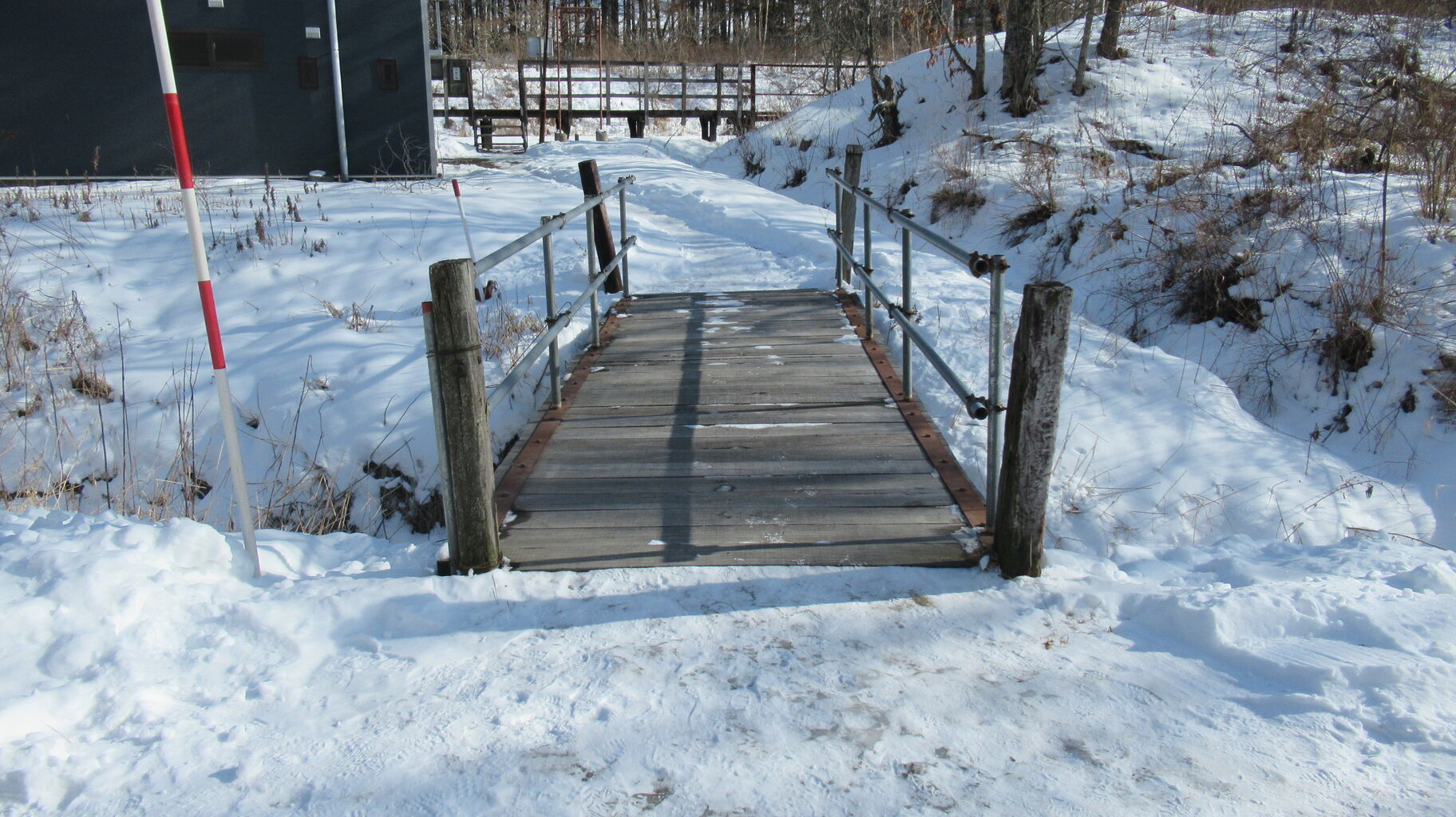 道路側溝にかかった橋を渡って駅ホームへ