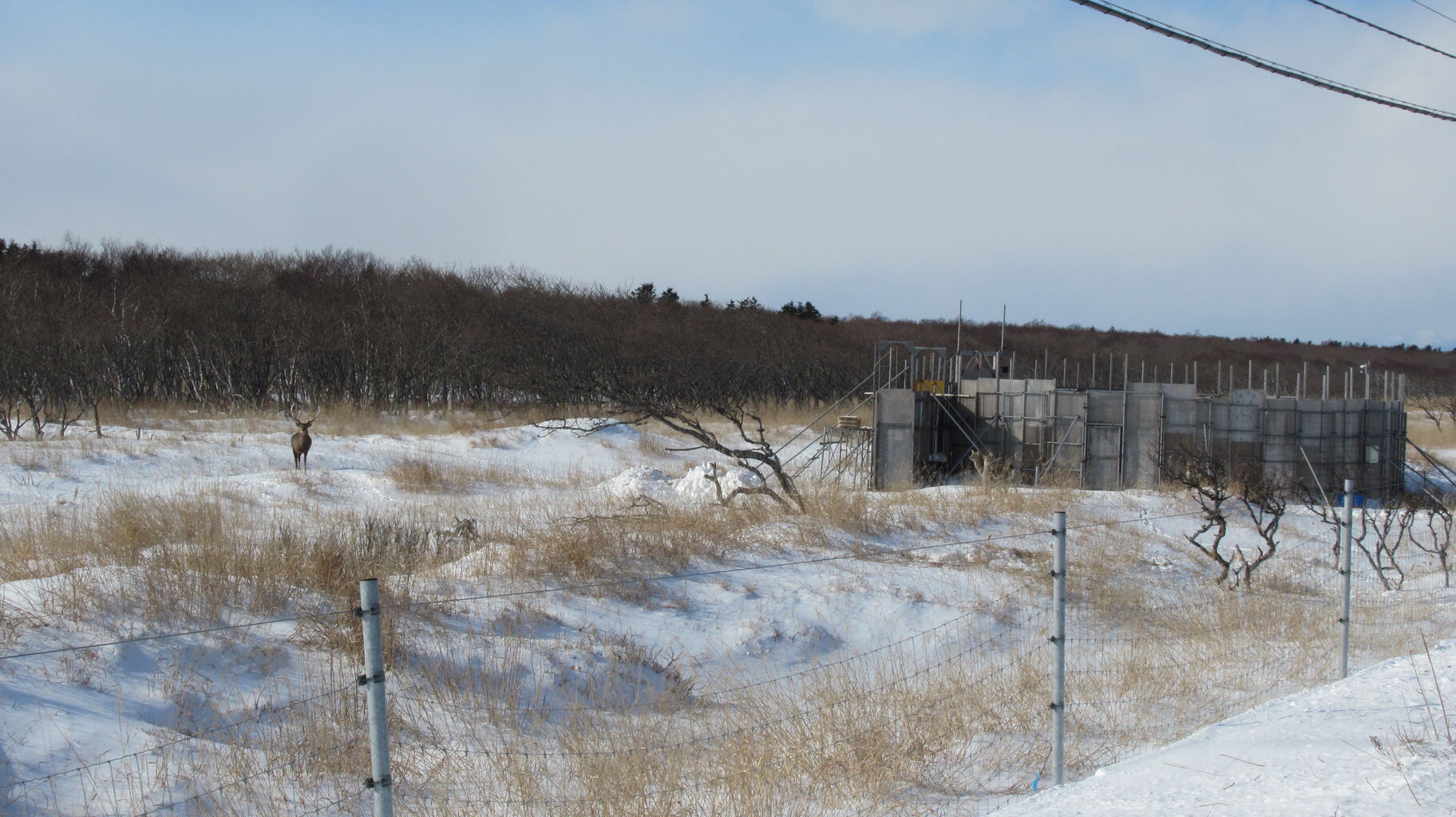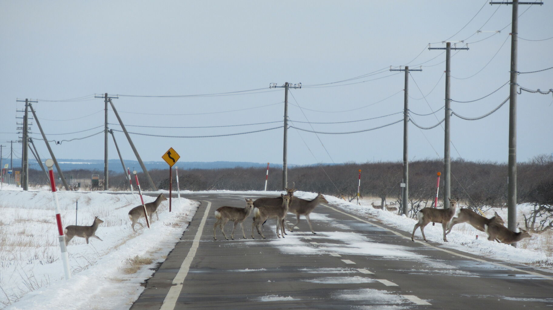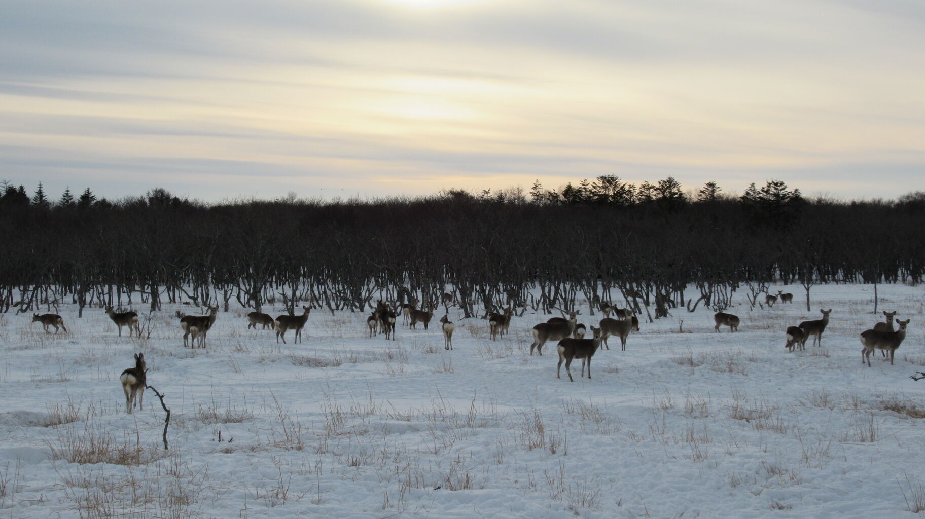 冬になるとエサの食べやすい雪の少ない場所に集まってくるエゾ鹿の群れ