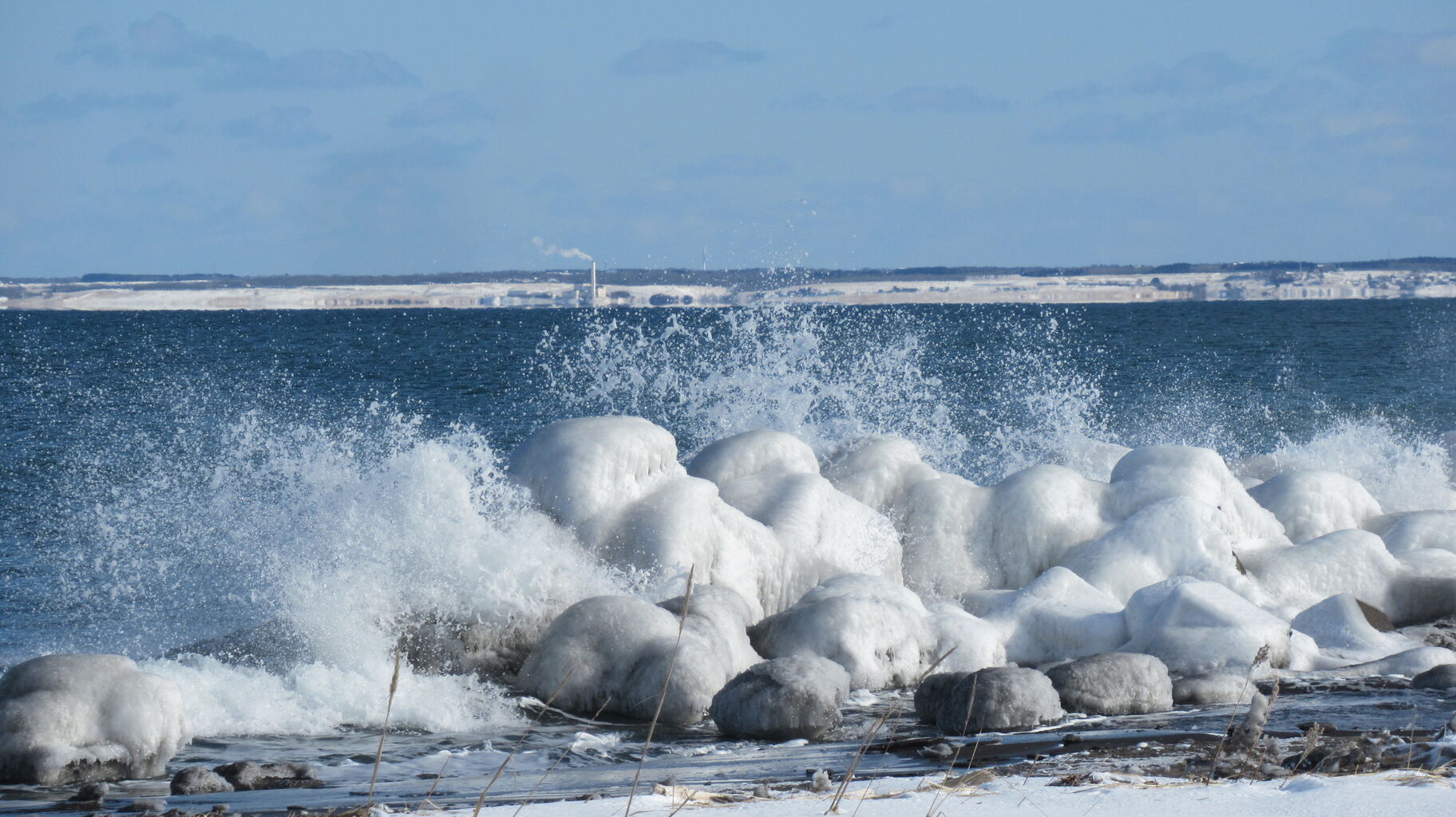 海を挟んで向こう側は根室半島、ごみ処理場の施設と煙突からの煙が見えます