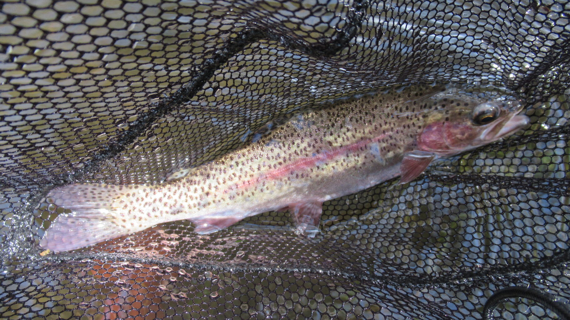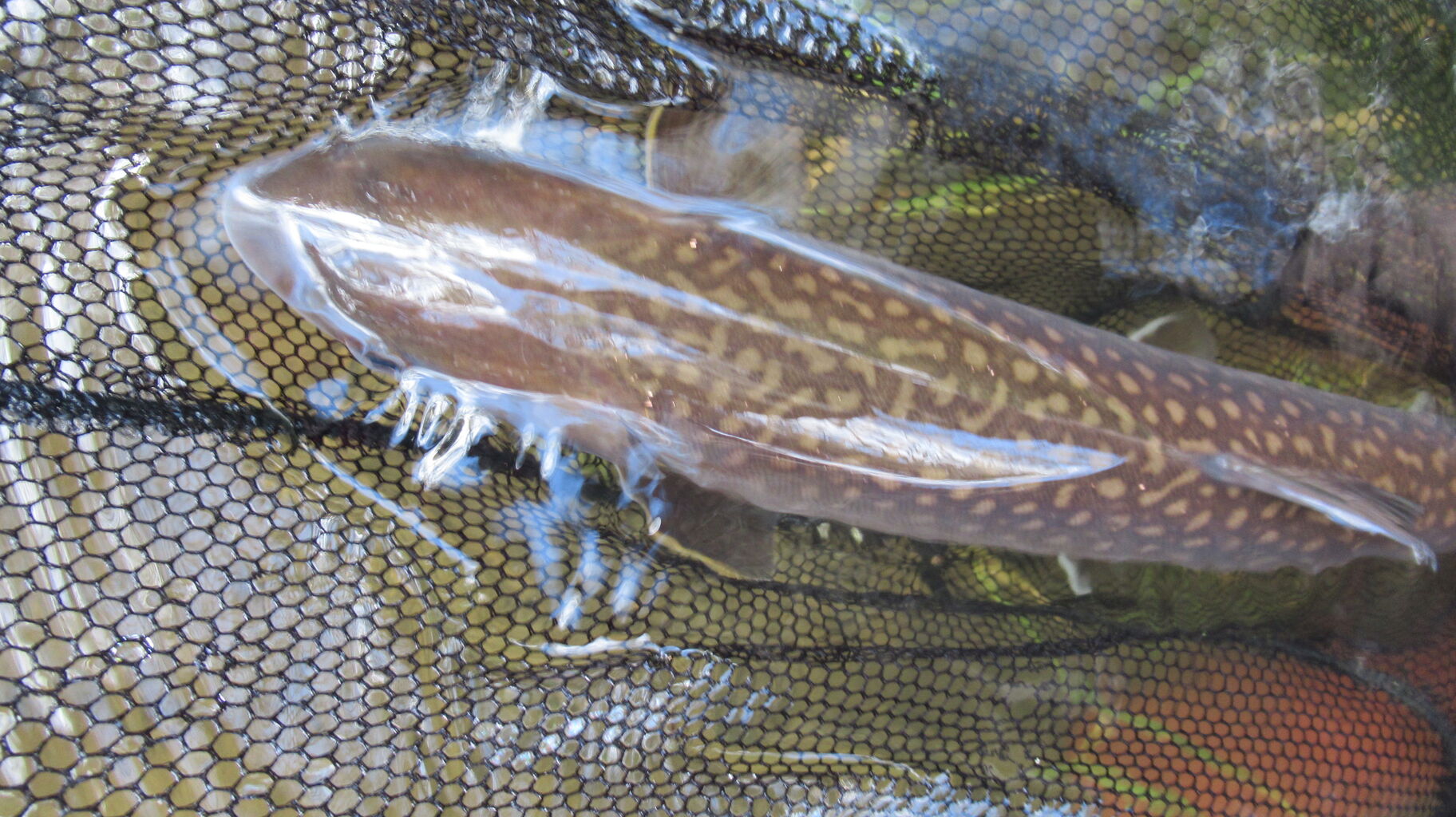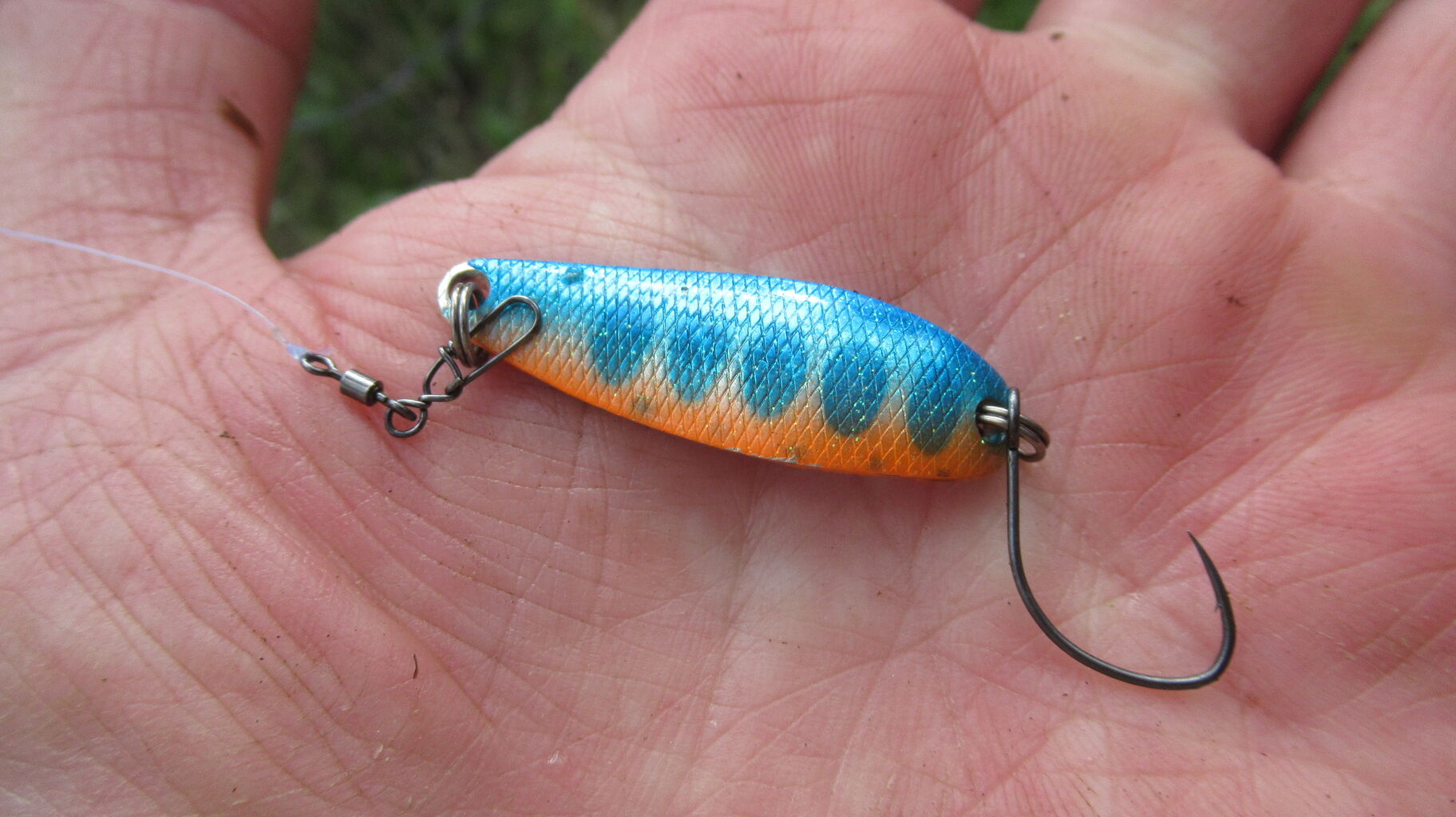ルアーはダイワ・シルバークリークミノーダートカスタム48S・チャートヘッド紅桜鱒