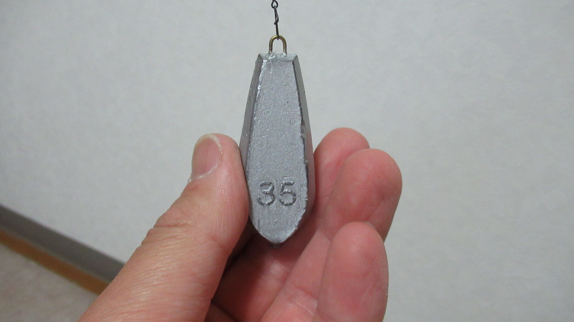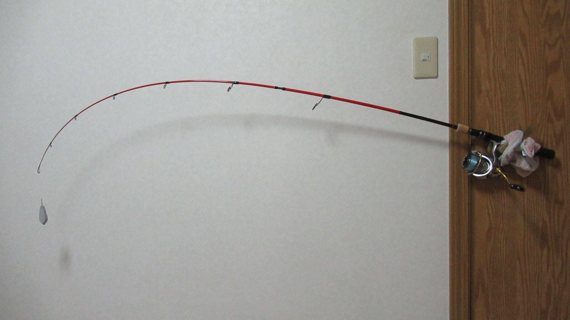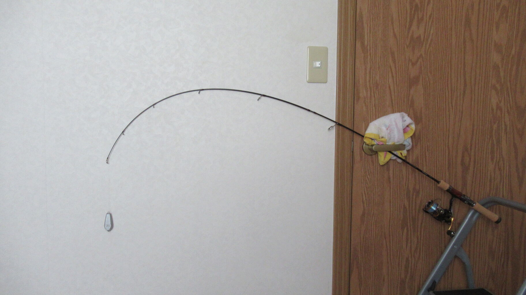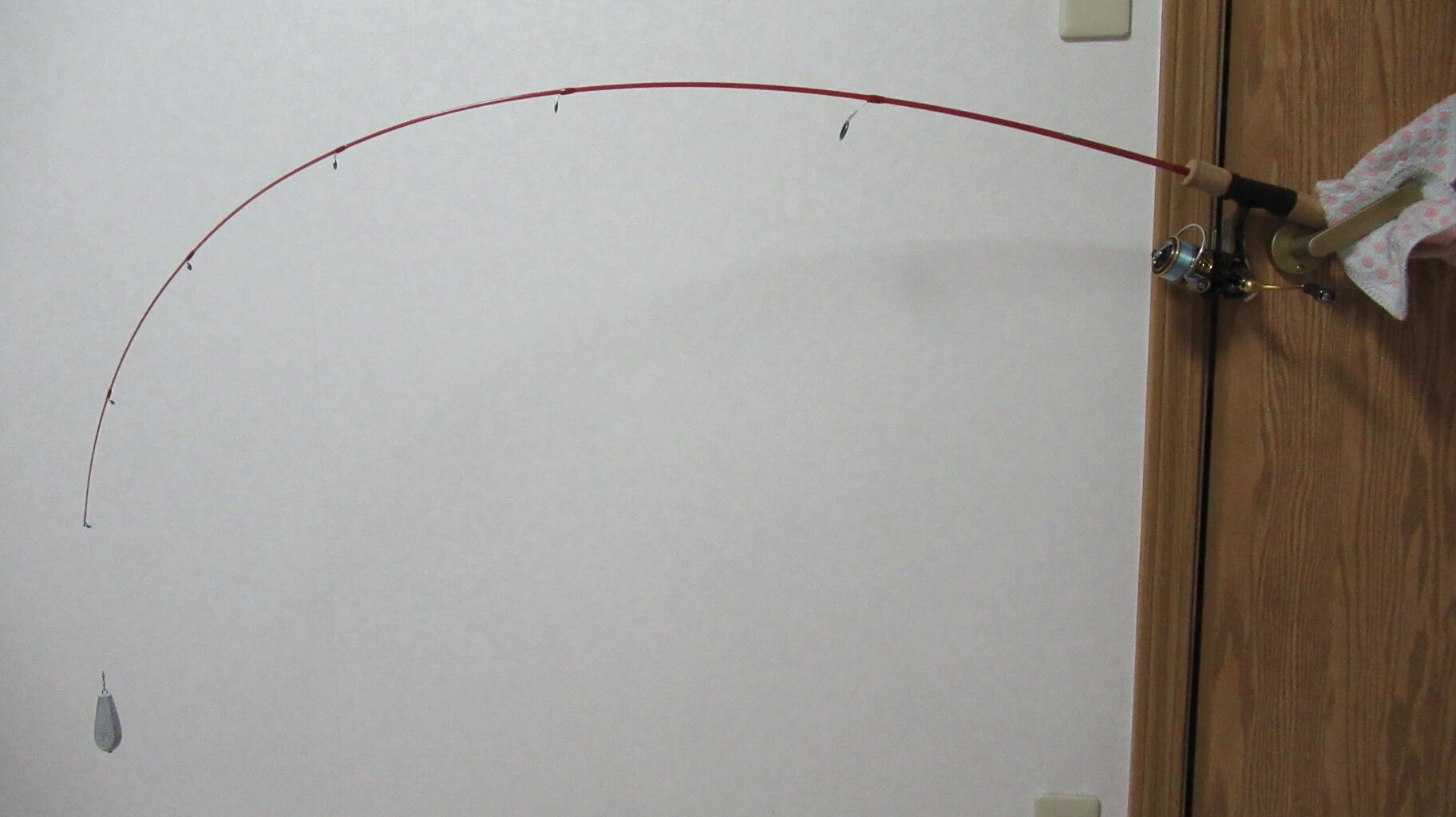 35号の鉛重りを垂らして竿の曲がり調子の様子を