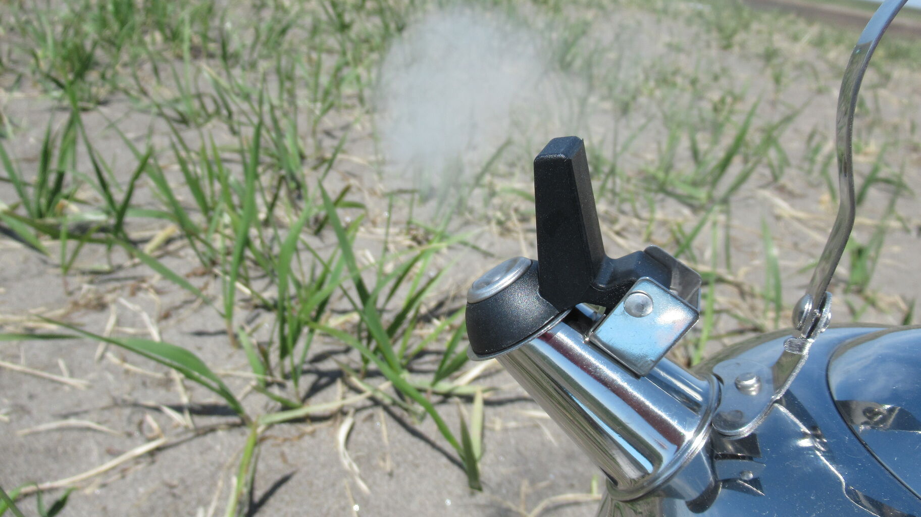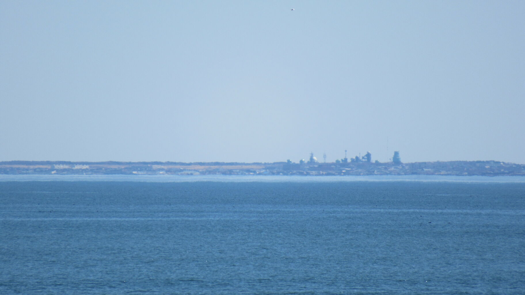 海を挟んで向こう側は根室半島、ごみ処理場の施設と煙突からの煙が見えます
